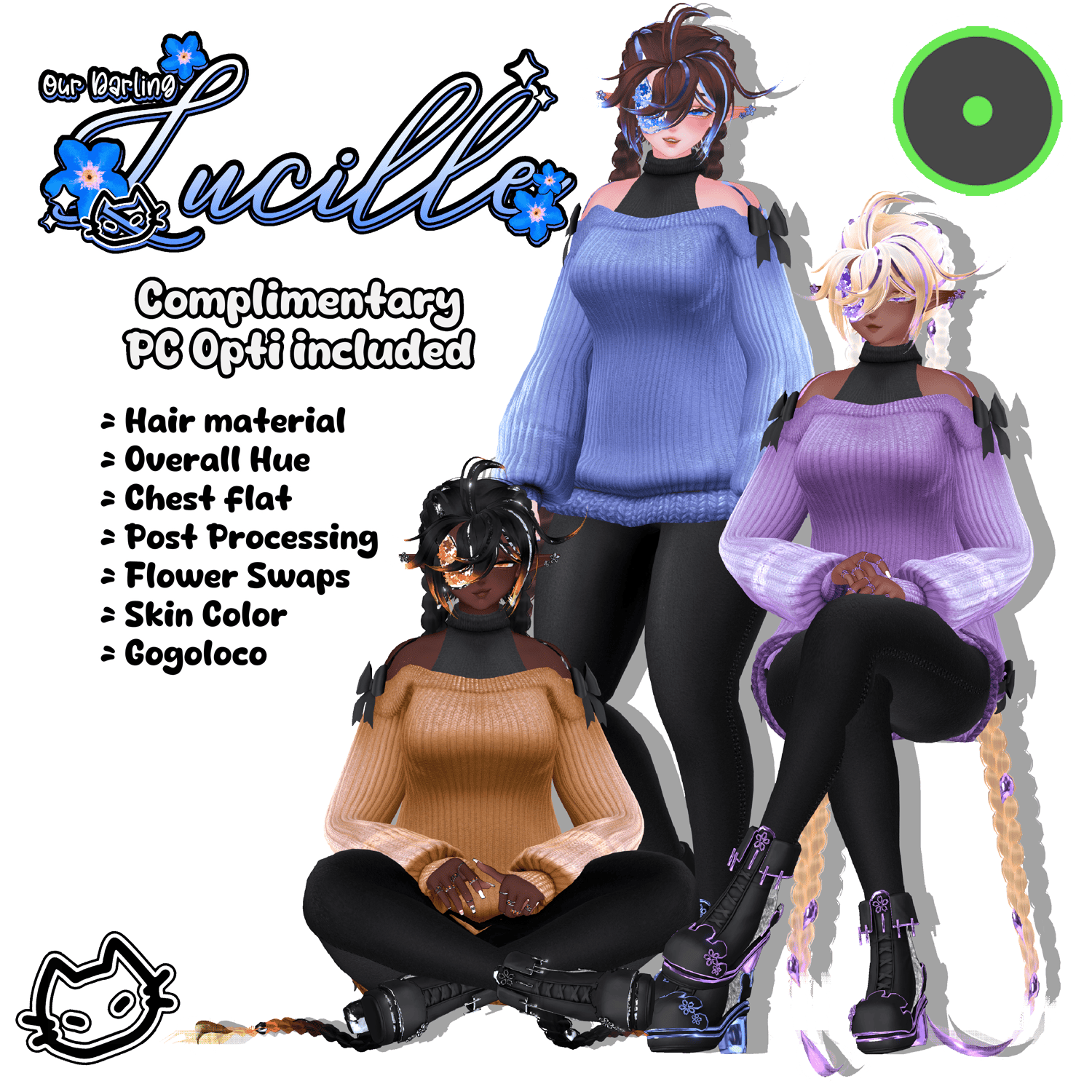 π 3 skintones, eye hue, clothing hue, clothing dark/lite, flower color swaps, Chest scale slider and flat chest, 8 metal colors, metal sparkle adjustment